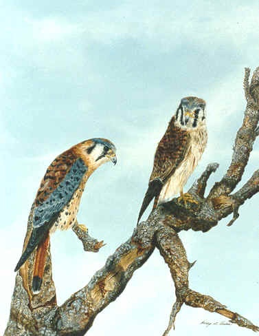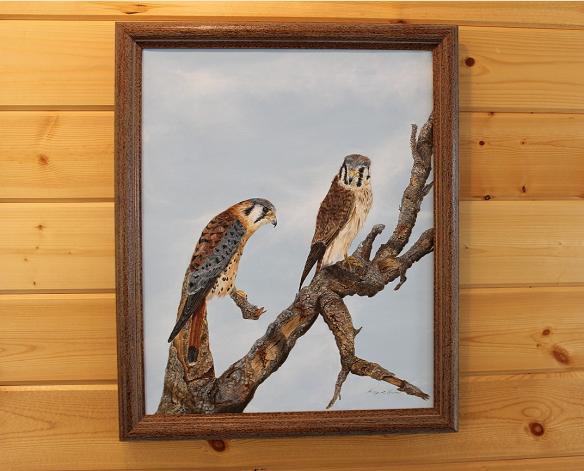 "First Impressions" is an original acrylic artwork on linen canvas, measuring 16" x 20", and is artistically framed in textured pecan, washed with gray, pale blue, and black. This Kestrel pair has just begun the courting ritual. The scene captures the first few moments of uncertainty as the male meets his potential mate. Poised higher on the branch of an old pine tree, the female regards him with reticence.