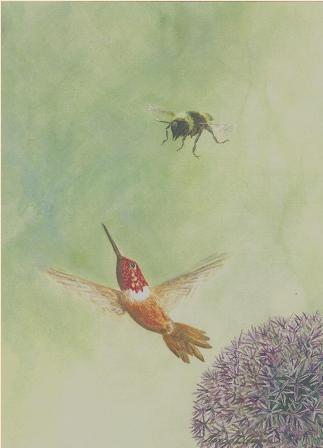 The Dance is reproduced from my original acrylic painting and is printed on an A7 (5" x 7") card. It is provided with a beautiful metallic, pearlized, lilac colored envelope. These cards are suitable for framing, as stated on the back of each one. I call it The Dance because the hummingbird and the bumblebee dance and swirl around each other until one of them gives up and looks for another allium flower. At some time haven't we all danced around one thing or another?