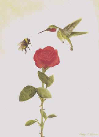 The Duel is reproduced from my original acrylic painting and is printed on an A7 (5" x 7") card, and is provided with a metallic pearlized gold colored envelope that combines classic taste with a "Wow factor". These cards are suitable for framing, and pair well with The Dance card. As the Bummblebee and the Hummingbird duel over the same rose, who do you think will win the sparring match?