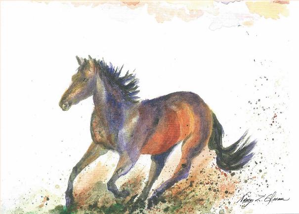 Wild Paint is third in a series of cards dedicated to celebrating the spirit of the horse. It is reproduced from my original watercolor painting and is printed on an A7 (5" x 7") card, and is provided with a metallic pearlized sand colored envelope. These cards are suitable for framing and feature a whimsical rendition of a wild mustang (truly a horse of a different color) in full gallop.