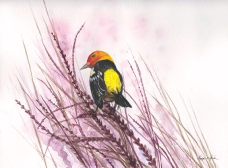 "Early Spring" is reproduced from an original watercolor painting and is printed on a framable A7 (5" x 7") card, which is provided with a metallic pearlized lilac colored envelope. The Western Tanager is a medium-sized American songbird that is now classified in the Cardinal family. It gets its scarlet head feathers from a rare pigment called rhodoxanthin. Unable to make this substance in their bodies, they most likely obtain it from the insects in their diet.