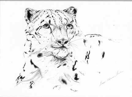 This artwork of a snow leopard is presented in a unique blend of realism and impressionism. It is presented in black and white.