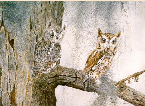 Awakening Shadows captures the early evening moments before the Screech Owls nightly search for food. Nancy hopes to set a mood that equates them with other birds of prey. Even though they are small in size, they are skilled hunters.