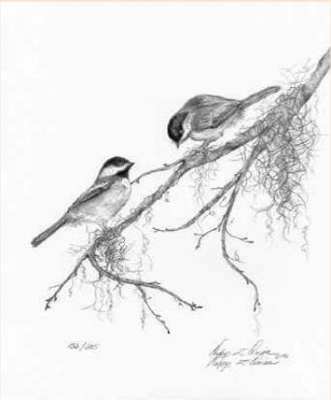 Winter Residents portrays the chickadees in a natural winter habitat. It is first in my chickadee series and is artistically created in black and white.