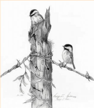 Nesting offers a close up view of the springtime rituals of the chickadee. It is second in the Chickadee series and is created in black and white with careful attention to detail.